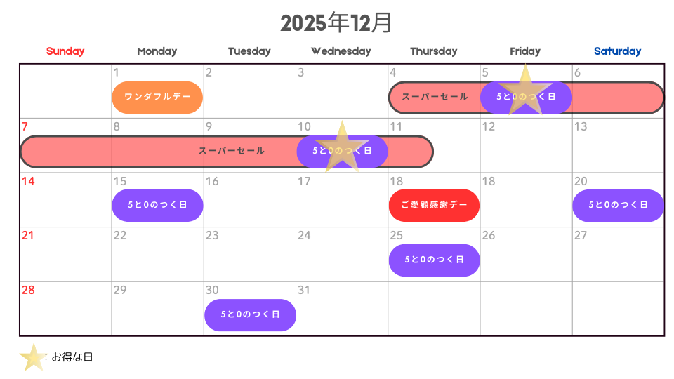 | 12月20日(土) | 5と0のつく日 | 4倍 | ||