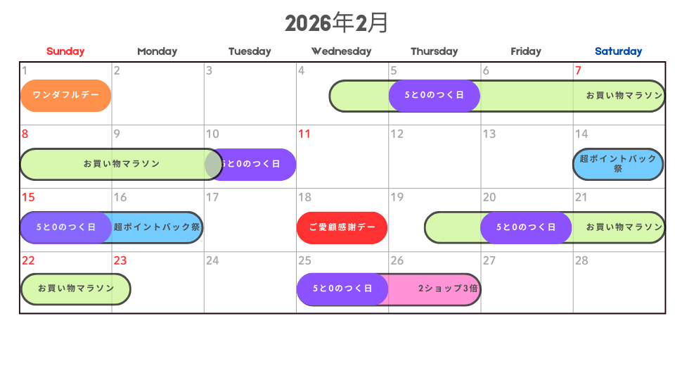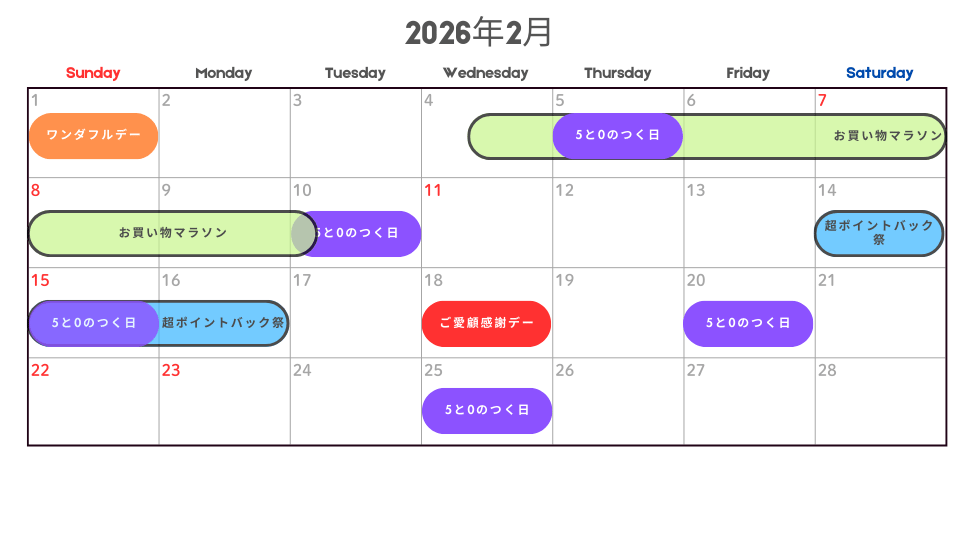 2026年2月に開催される楽天市場の主なキャンペーン日程をカレンダー形式で分かりやすく整理しています。買い時をひと目で確認できます。