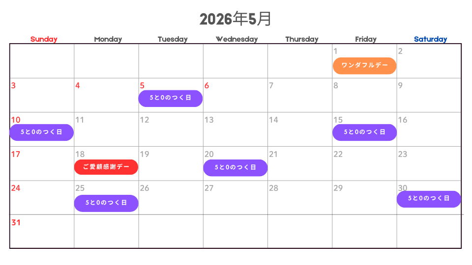 | 5月5日(火) | 5と0のつく日 | 4倍 | ○ | |