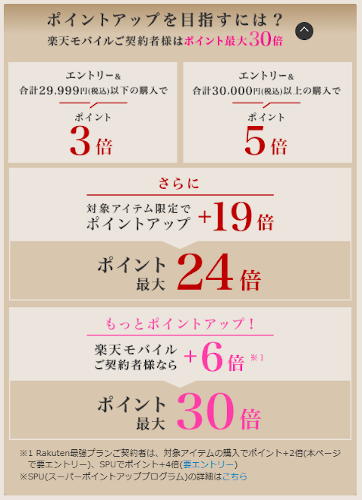 と、最大合計24倍、楽天モバイル契約者は最大30倍までポイントが増額します。