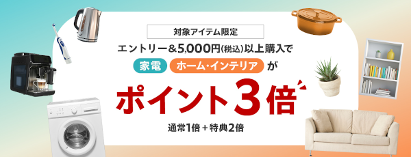 エントリーして家電ジャンルとホーム・インテリアジャンルで5,000円以上(税込)購入するとポイントが3倍(+2倍)になります。