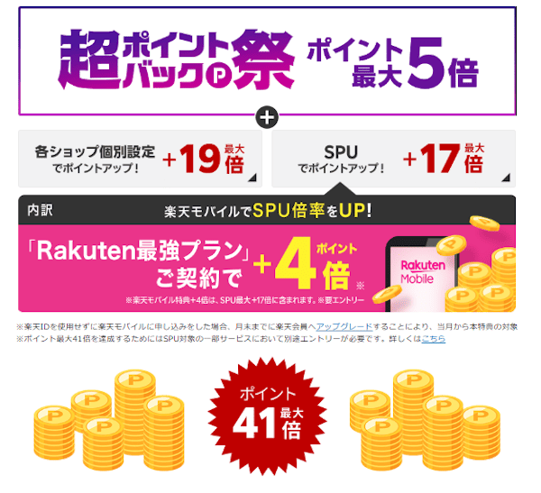 超ポイントバック祭で獲得することができる最大ポイントは41倍となります。