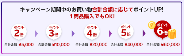 - 60,000円(税込)以上でポイント6倍(通常ポイント1倍+特典ポイント5倍)