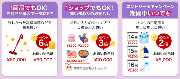 購入商品数や購入店舗数にかかわらず、キャンペーン期間中の合計購入金額で付与倍率が最大6倍になるので、高額商品の1点買いに適したキャンペーンとなっています。