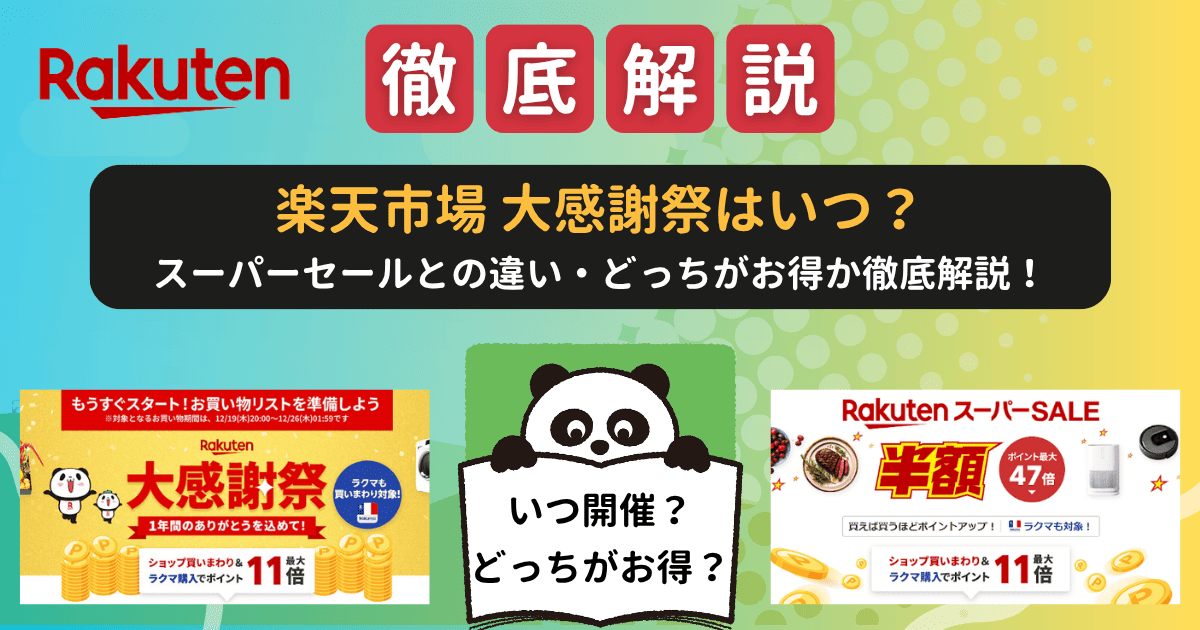 この記事では、楽天大感謝祭の開催時期、概要とポイントアップの仕組み、「楽天スーパーセール」との違い、どちらがよりお得かをわかりやすく解説します。